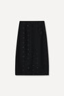 허리선에서부터 자연스럽게 퍼지는 A라인 실루엣이 다리를 길고 슬림하게 표현해주며 롱 기장감으로 차분하면서도 세련된 무드를 완성합니다. 탄탄하고 매트한 텍스처의 원단 위에 은은하게 반짝이는 비즈를 더해