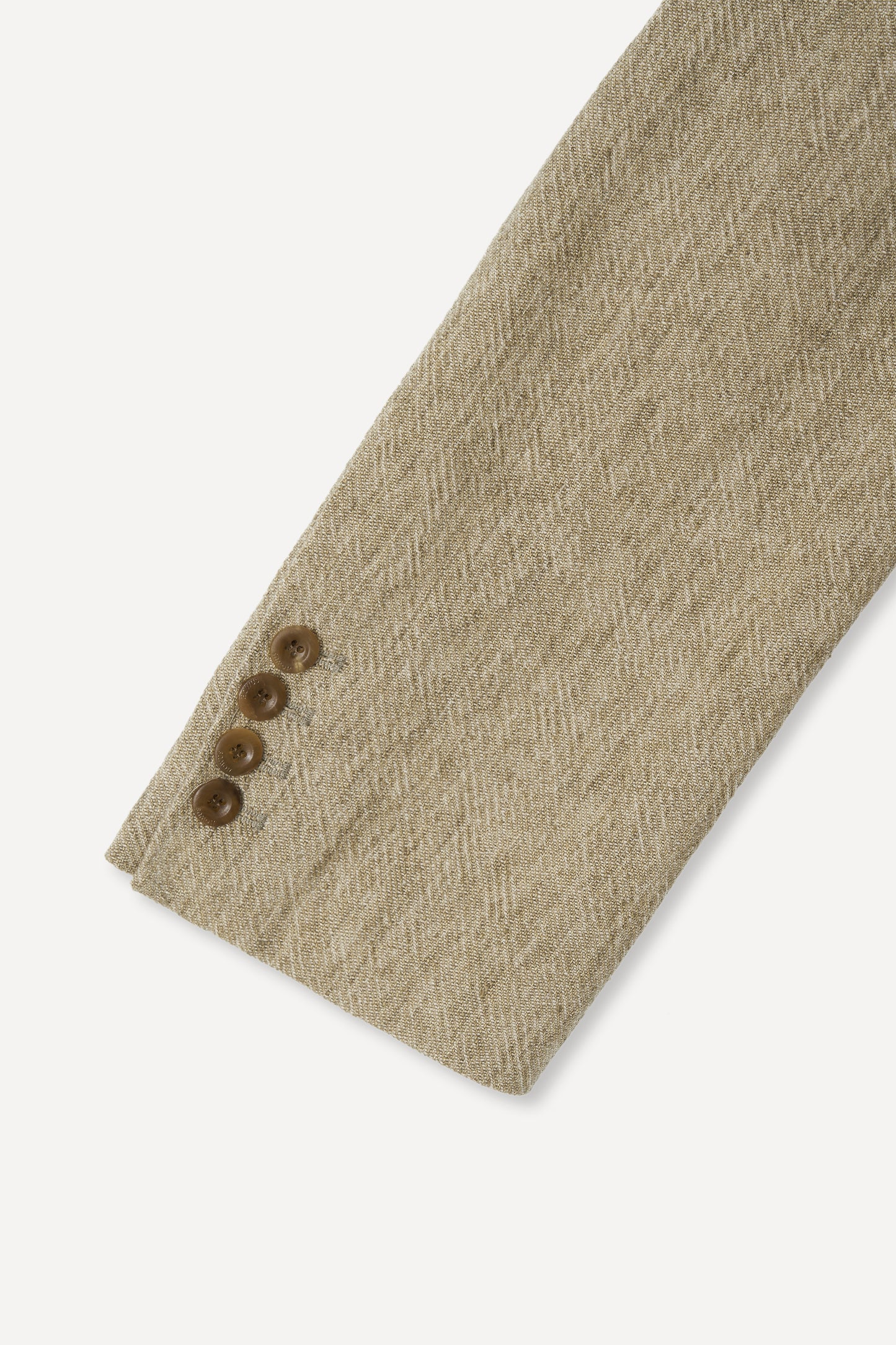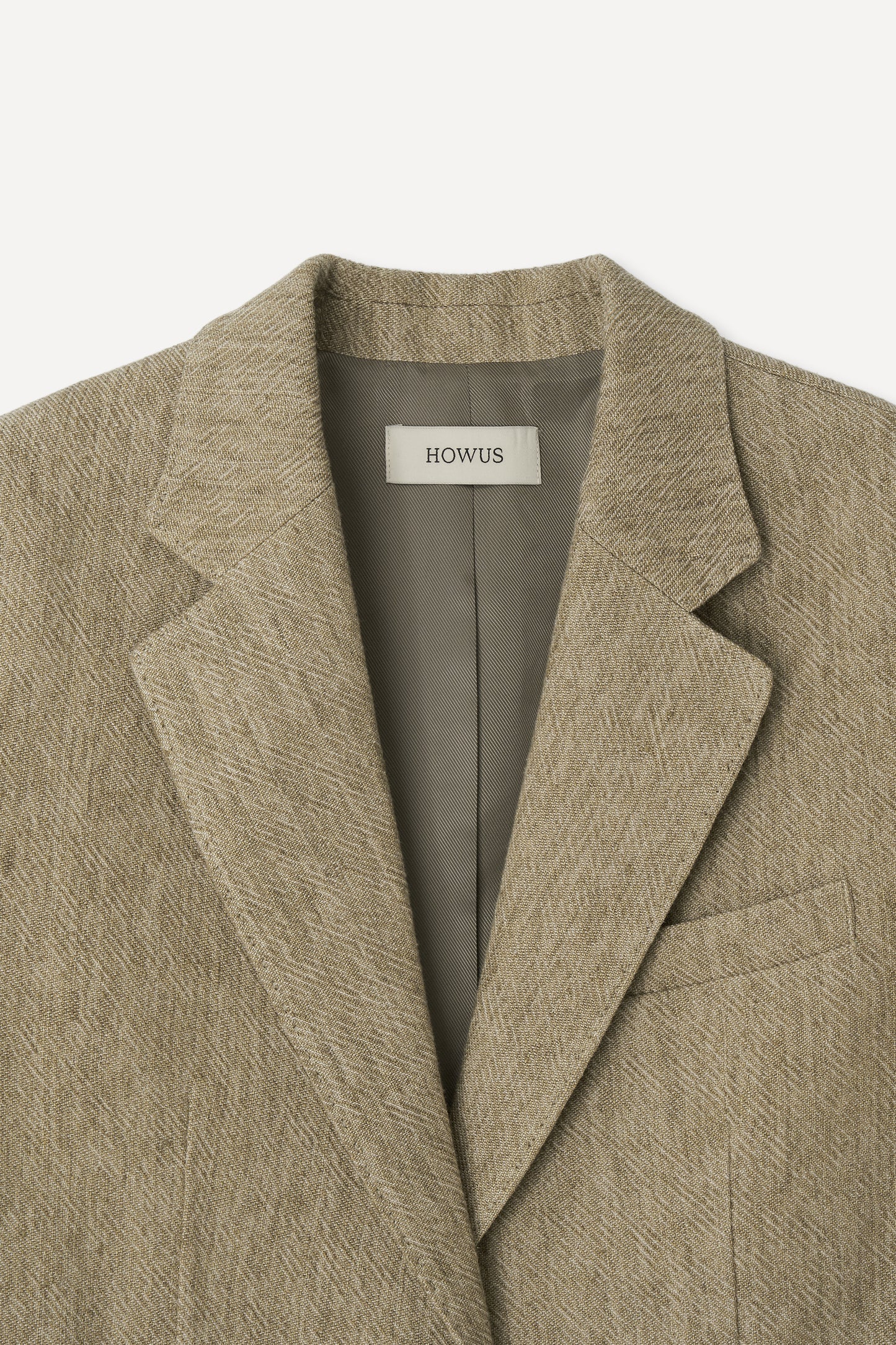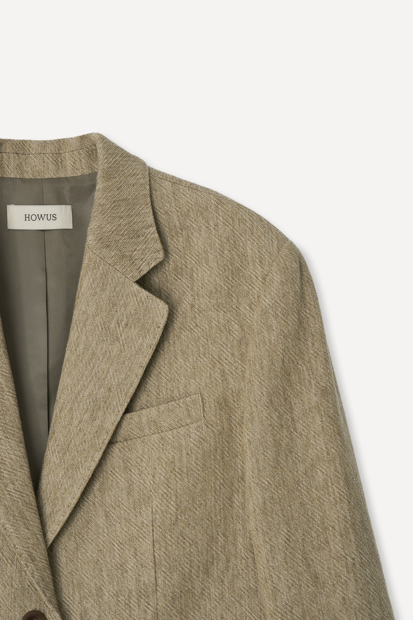 고급스러운 터치감과 자연스러운 색감이 돋보이는 아이템으로 시간이 지날수록 멋스럽게 자리 잡는 빈티지한 감성이 매력적인 아이템입니다. 16리 경사와 7수 코튼 위사로 짜여진 프리미엄 린넨 트윌 원단을 사용해 견고하면서도 부드러운 텍스처를 자랑하며 바이오 워싱 공정을 거쳐 자연스러운 컬러와 고급스러운 표면 감을 완성했습니다. 사염 후 추가된 바이오 워싱으로 깊이 있는 색감을 표현해 착용 시 멋스럽게 변해가는 소재의 매력을 느낄 수 있습니다. 싱글 브레스티드 디자인과 허리선을 자연스럽게 잡아주는 프린세스 패널 패턴이 정제된 실루엣을 선사하며 프론트 아웃라인에 덧대어 박음질한 디테일로 미니멀하면서도 고급스러운 분위기를 연출합니다. 프론트 플랩 포켓과 가슴 버튼 디테일, 실용적인 내부 포켓까지 섬세하게 제작되었습니다. 전체 안감을 사용해 안정적인 핏과 편안한 착용감을 제공합니다. 같은 원단으로 제작된 LIBER LINEN SINGLE SLACKS와 함께 매치하면 세련된 셋업 스타일을 완성할 수 있습니다.