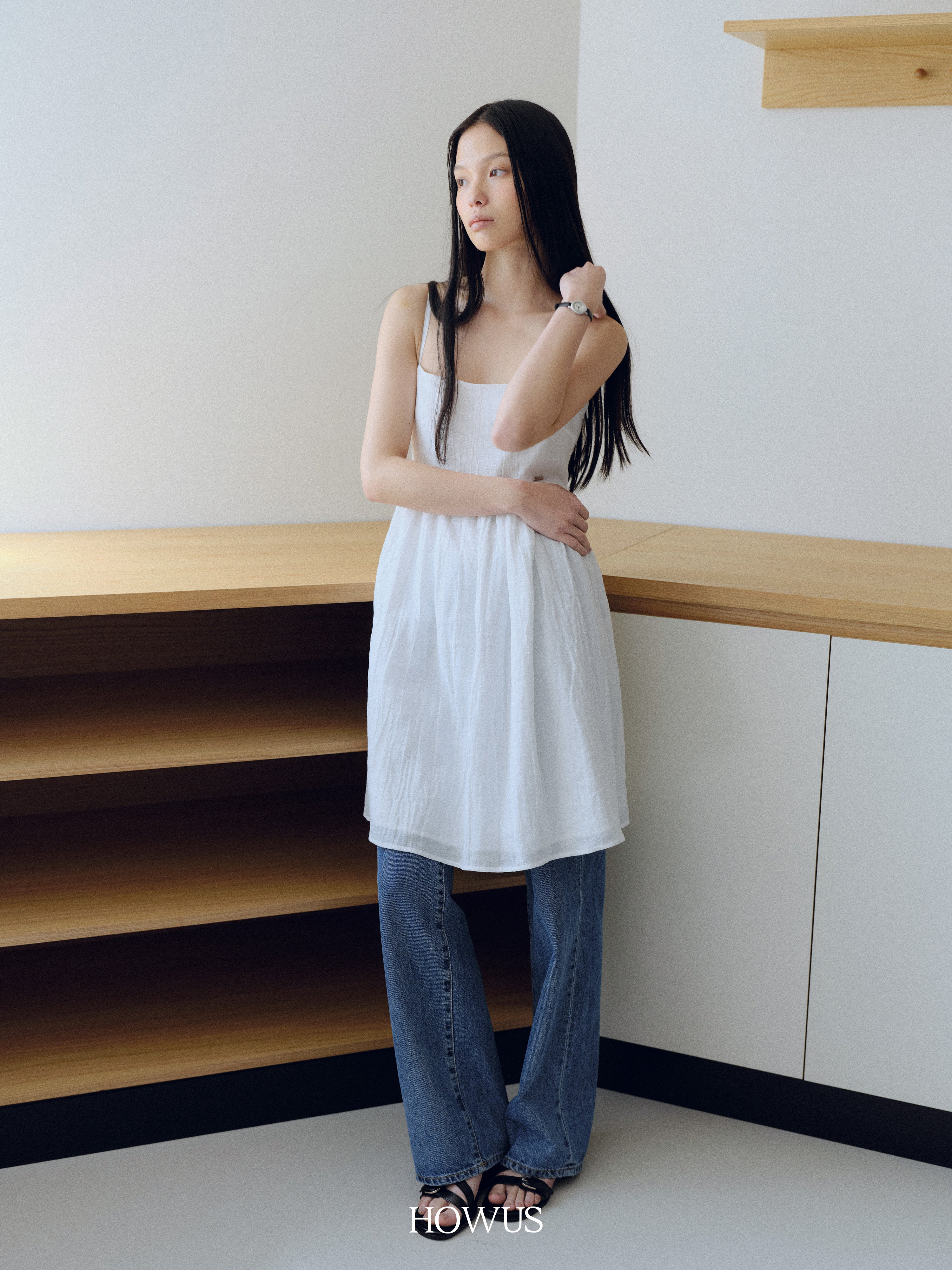 미디 기장감으로 무릎 위로 올라오는 디자인은 경쾌하고 시원한 느낌을 주며 여름철에도 부담 없이 착용할 수 있는 아이템입니다. 끈을 묶어 사이즈를 자유롭게 조절할 수 있어 체형에 맞춰 더 편안한 핏을 완성할 수 있습니다. 스퀘어 넥라인이 특징으로 쇄골을 아름답게 강조해 여성스러운 분위기를 연출하며 허리선이 높게 잡혀 있어 다리가 길어 보이는 효과를 줍니다. 사이드 지퍼 디테일은 깔끔하고 세련된 마무리를 더 해 전체적인 미니멀한 무드를 강조하며 세련된 포인트의 HOWUS 로고 장식을 더 하여 더욱 특별하게 완성했습니다.